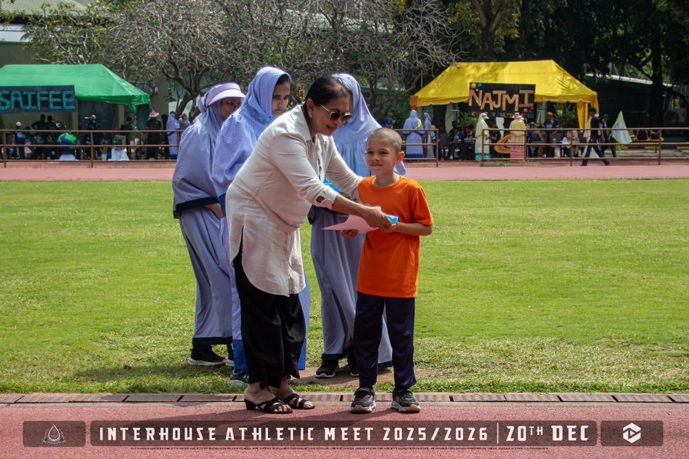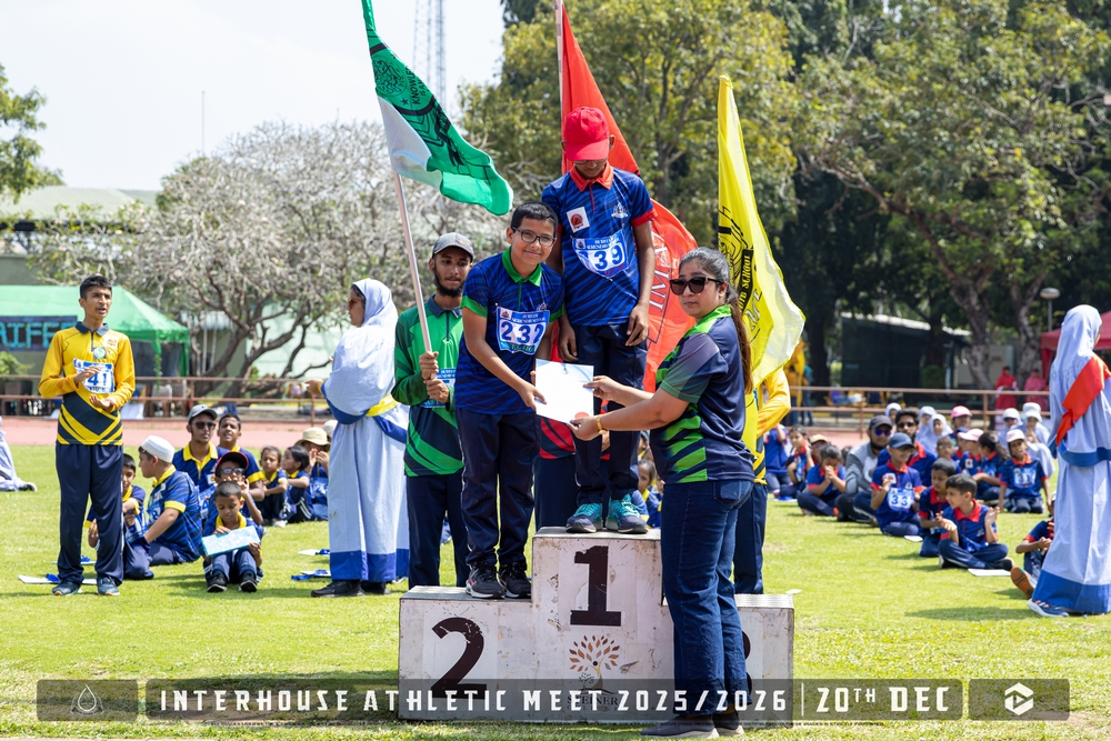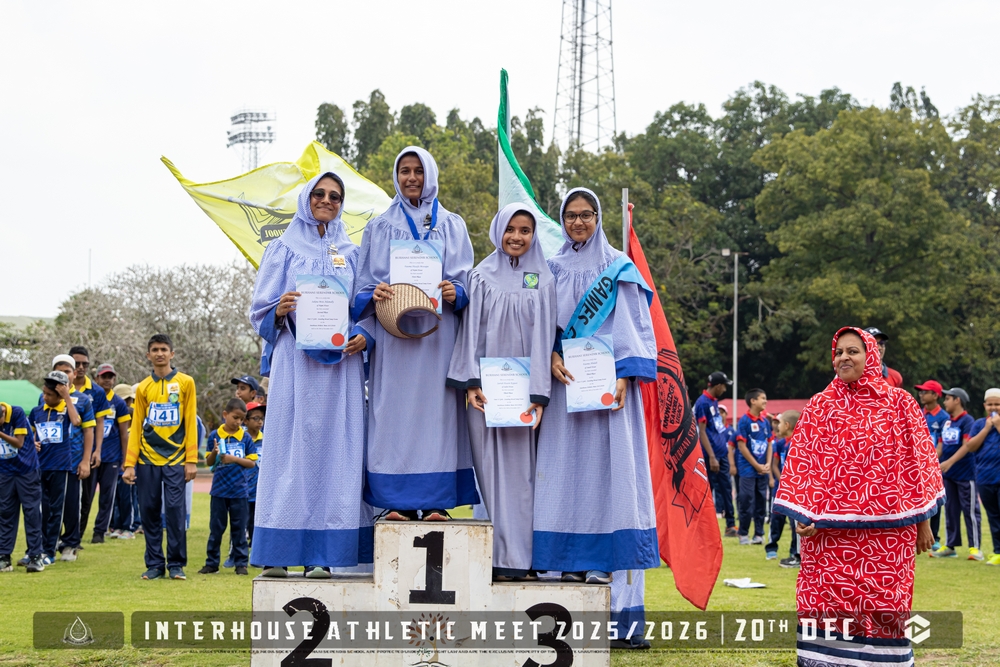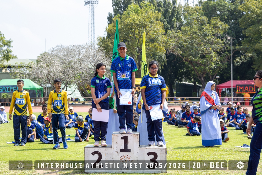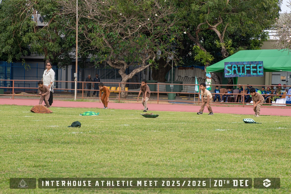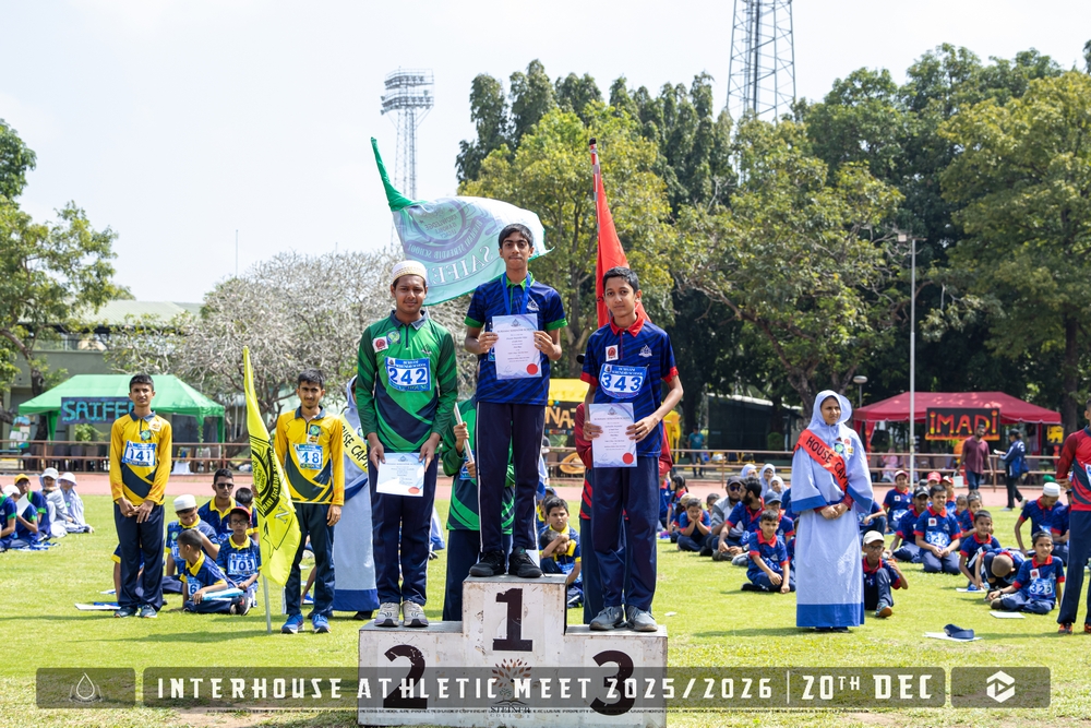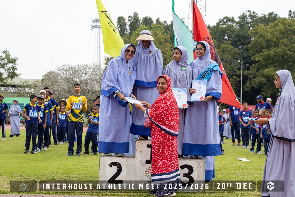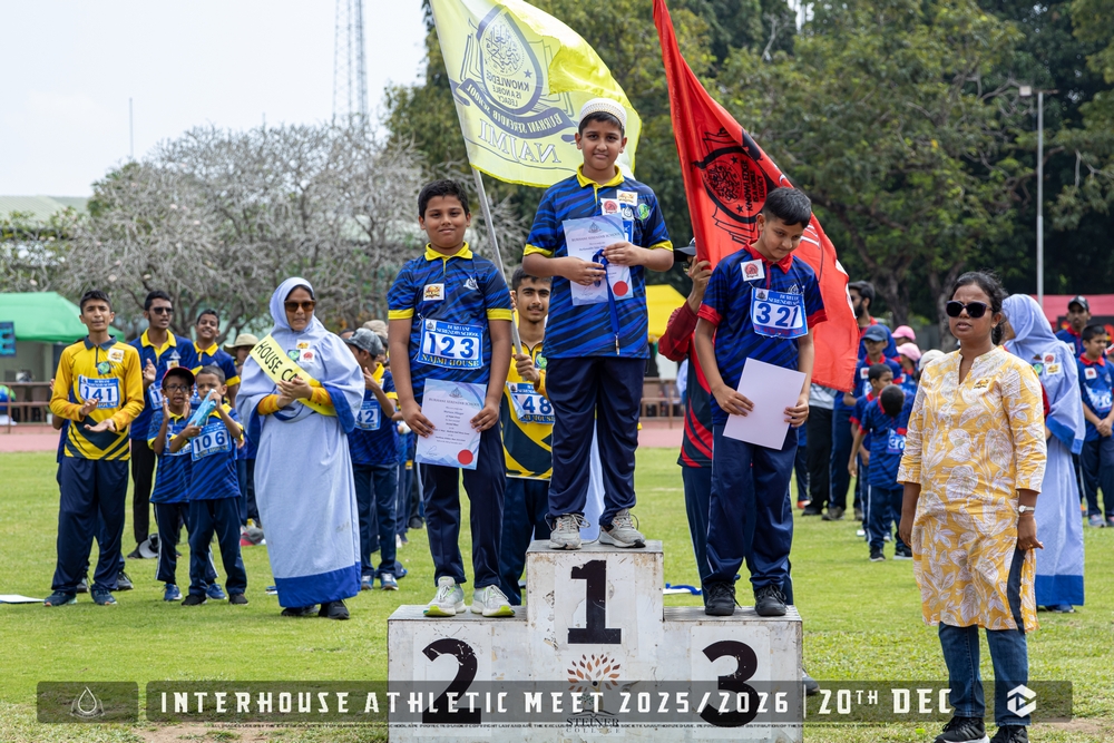 The meet concluded with SAIFEE House securing First Place, followed by IMADI House in Second Place. NAJMI House finished in Third Place, displaying determination, resilience and commendable sportsmanship. Congratulations to all participants for making the Interhouse Athletic Meet 2025/26 a successful and memorable event.